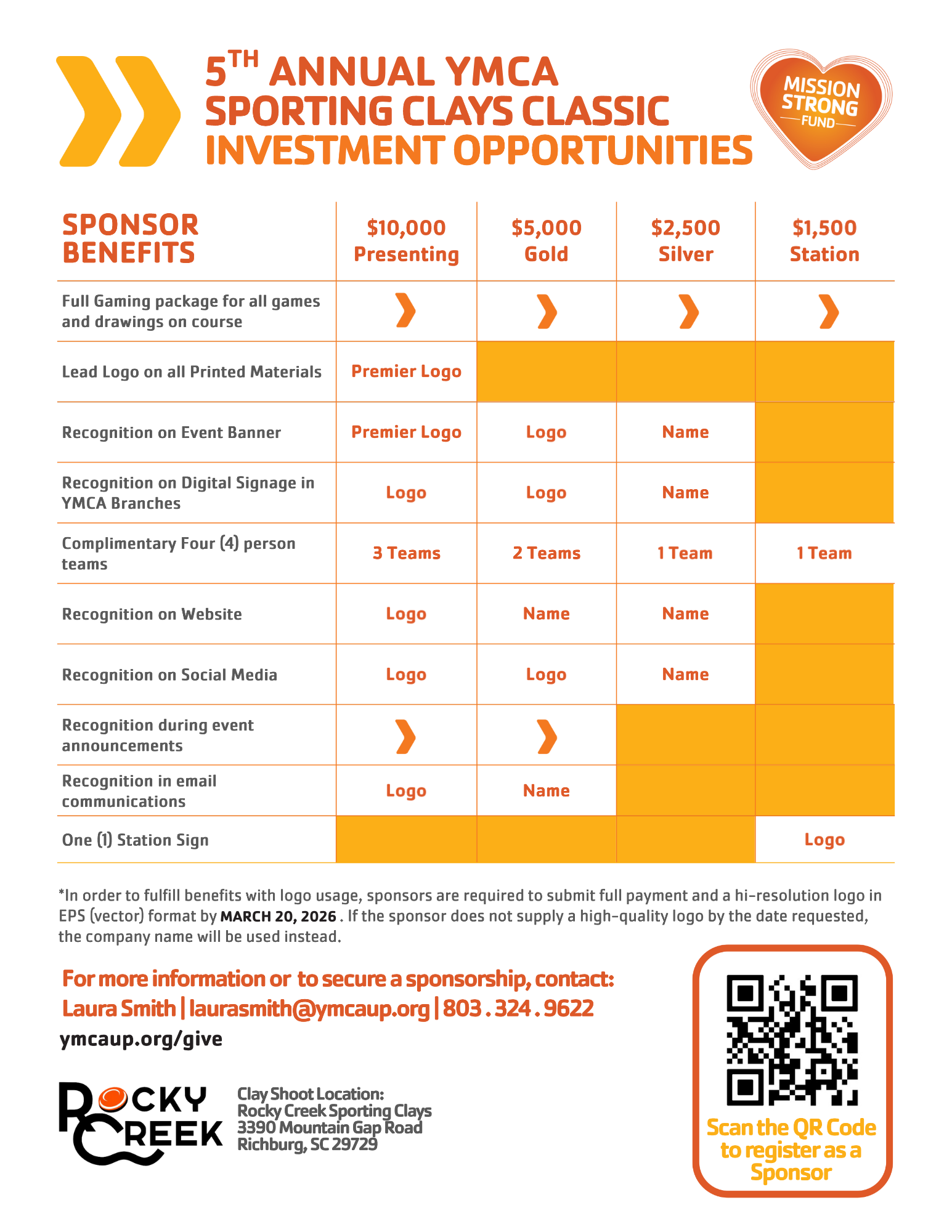 All sponsors will be recognized on YMCA of Upper Palmetto’s website and have the opportunity to provide promotional materials to be included in participant goodie bags. YMCA of Upper Palmetto is an approved section 501(c)(3) organization, and as such, all contributions are tax deductible (Tax ID 57-0335422).